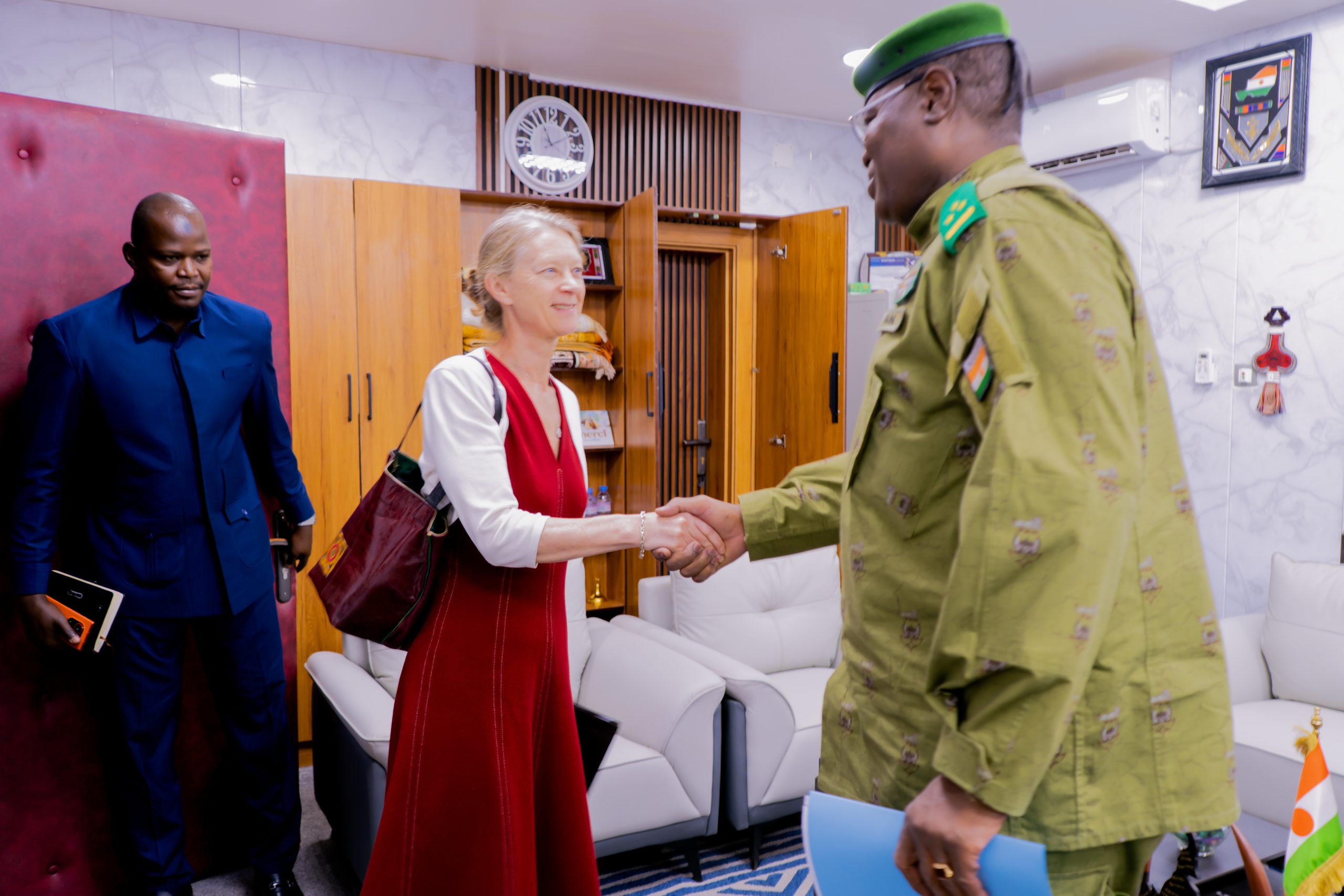 Le Ministre d’État, Ministre de l’Intérieur, de la Sécurité Publique et de l’Administration du Territoire, le Général de Division Mohamed TOUMBA a reçu ce jour 09 Mars 2026 à son cabinet , l’Ambassadrice du Royaume Uni au Niger.